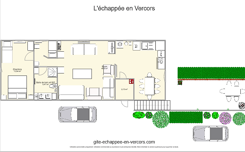 Sur 70 m2, L’Echappée en Vercors offre toutes les commodités d’un gîte de grand confort et peut accueillir jusqu’à 6 personnes. Votre location au coeur du Vercors comprend une grande terrasse ombragée par sa vieille vigne avec vue exceptionnelle sur le massif du vercors, elle a été aménagée avec du mobilier en bois, un parasol, des chaises longues et un barbecue.