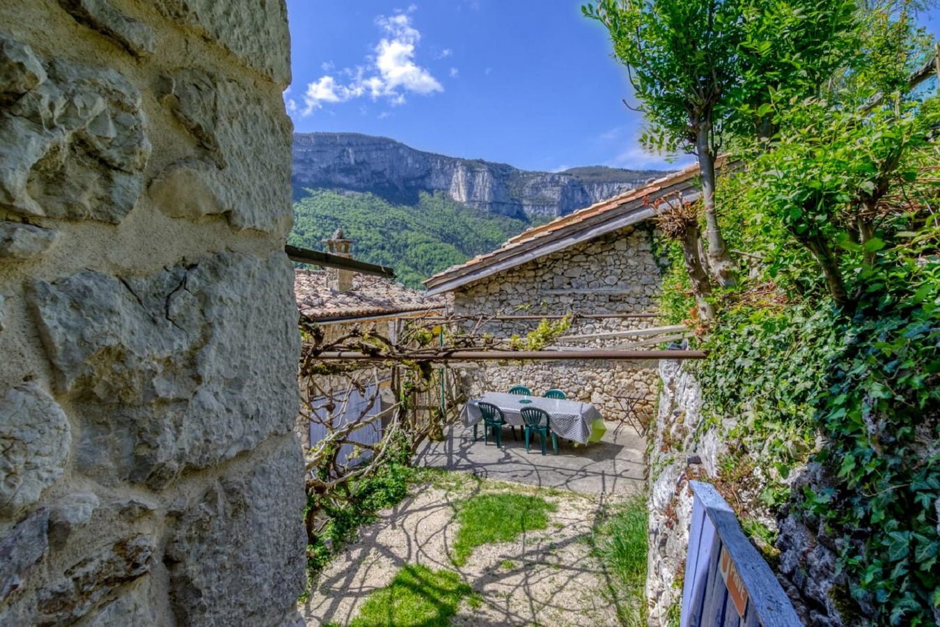 Les abords du gîte sont verdoyants et aménagés avec de la roche locale. Une vue extra-ordinaire sur les falaises de Presles et Choranche, le cirque du Bournillon et sa cascade Moulin Marquis (2ème plus haute chute d’eau de France).